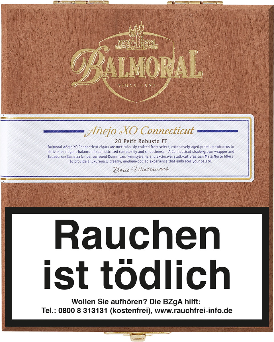 Die Balmoral Añejo XO Connecticut Petit Robusto FT bietet cremigen Rauchgenuss mit komplexen Aromen & edlem Connecticut-Deckblatt samt kunstvollem Flagtail.