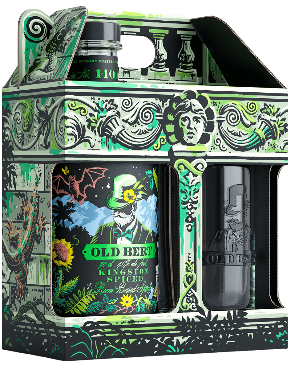 Old Bert Kingston Spiced auf Rum Basis genießt man auf Eis, pur oder als Longdrink mit Cola, Tonic oder Ginger Beer, ergänzt durch frische Zitrusfrüchte. Zum Set gehört ein passendes Glas, das den Genuss stilvoll abrundet. Das kunstvoll gestaltete Etikett aus strukturiertem Papier mit grüner Prägung und handgemalten Motiven unterstreicht den exklusiven Charakter dieses Geschenksets.
