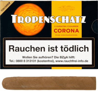 Die Tropenschatz-Serie wird in Deutschland produziert und genießt unter Kennern einen guten Ruf als zuverlässiger Shortfiller im unteren Preissegment. Wer auf der Suche nach einer günstigen, aromatisch ausgewogenen Zigarre mit Charakter ist, trifft mit der Tropenschatz Nr. 421 F Sumatra die richtige Wahl.
