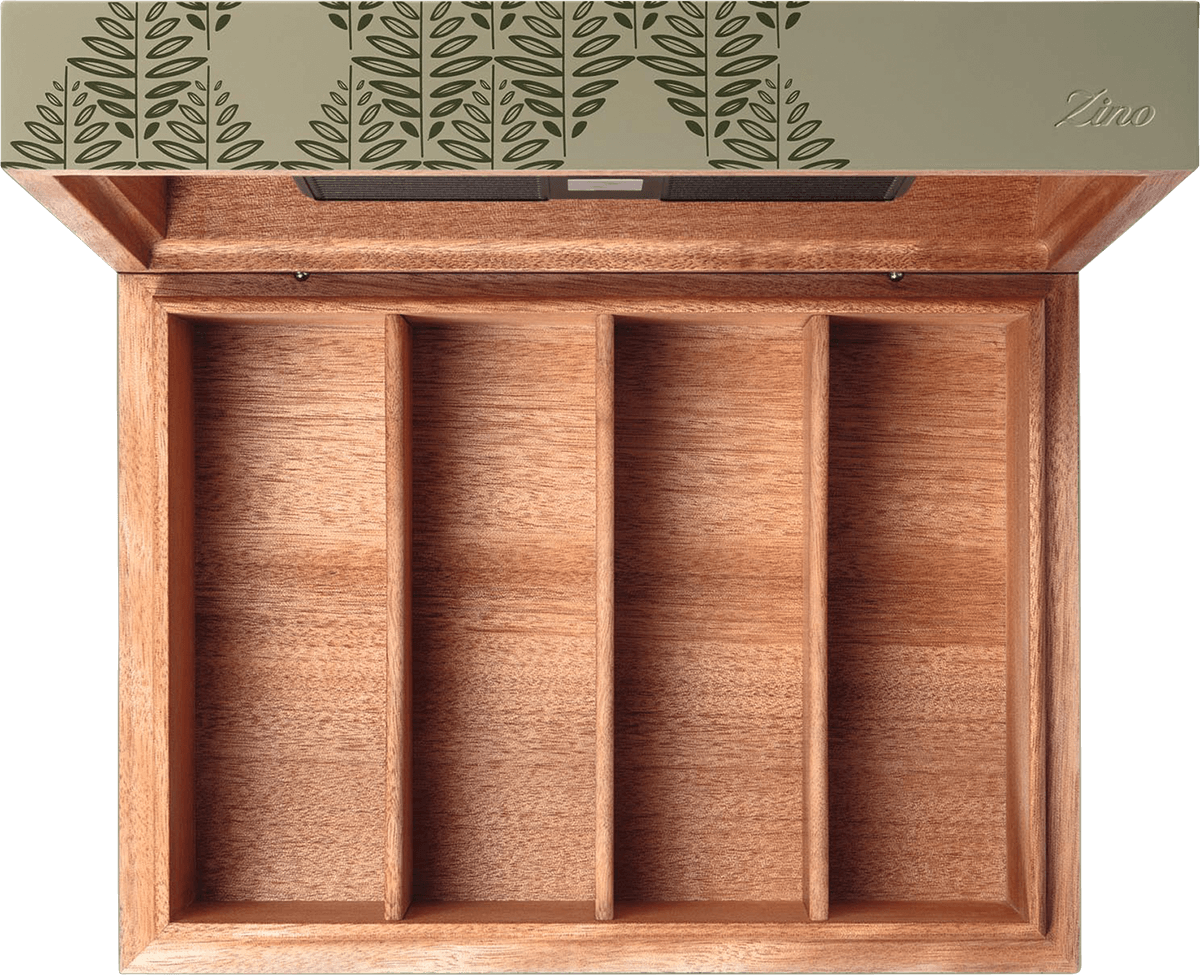 Auch die Außenseite überzeugt mit edlem Design. Sie besteht aus olivgrün gefärbtem Okoumé-Holz, das dem Humidor eine stilvolle und natürliche Optik verleiht. Der Deckel ist mit einem eleganten Tabakblatt-Design in dunklem Grün verziert. Ein Filzboden sorgt für sicheren Stand auf jeder Oberfläche und schützt gleichzeitig empfindliche Möbel vor Kratzern. Mit einer Kapazität von bis zu 60 Toro-Zigarren bietet der Humidor ausreichend Platz für Sammler und Gelegenheitsraucher gleichermaßen. Die kompakten Abmessungen machen ihn zum idealen Aufbewahrungsort, der sich problemlos in jedem Raum integrieren lässt. Der Zino Z-Collection Green Humidor Z60 verbindet exklusive Optik, langlebige Materialien und durchdachte Funktionalität zu einem perfekten Begleiter für Ihre Zigarrensammlung.