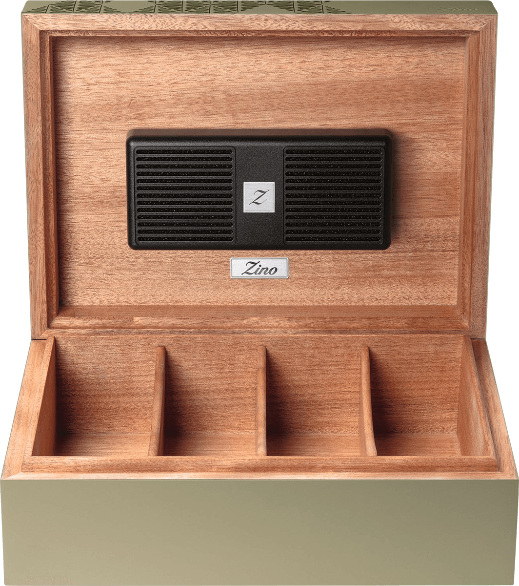 Der Zino Z-Collection Green Humidor Z60 ergänzt diese Kollektion perfekt. Sein hochwertiges Okoumé-Holz im Inneren sorgt für eine geschmacks- und geruchsneutrale Aufbewahrung, sodass die Aromen der Zigarren erhalten bleiben. Die elegante Innenauskleidung schützt zuverlässig vor äußeren Einflüssen, während das selbstregulierende Befeuchtungssystem konstante optimale Bedingungen von 70 bis 72 % relativer Luftfeuchtigkeit gewährleistet. Ein starker Magnet im Deckel hält den Befeuchter sicher an seinem Platz, sodass jede Zigarre unter perfekten Bedingungen gelagert wird. Das gravierte Zino Logo auf einer silbernen Plakette am Deckel unterstreicht die Hochwertigkeit des Humidors. Drei Trennwände sorgen im Inneren für eine praktische Aufbewahrung und Organisation Ihrer Zigarren.