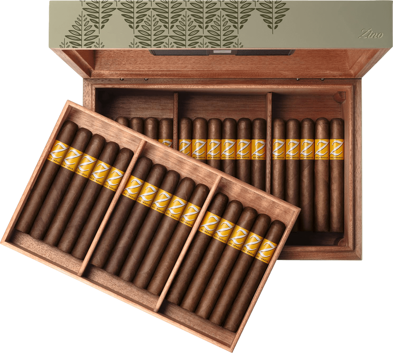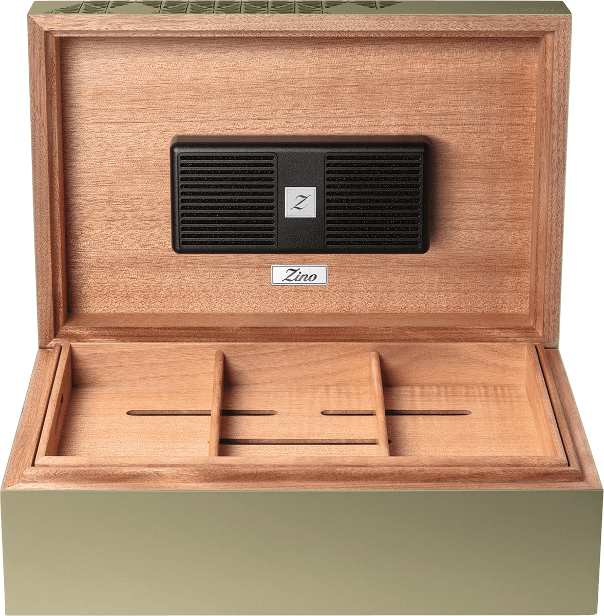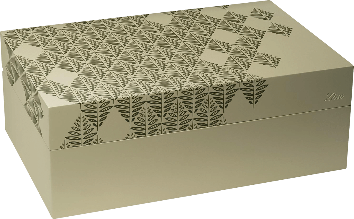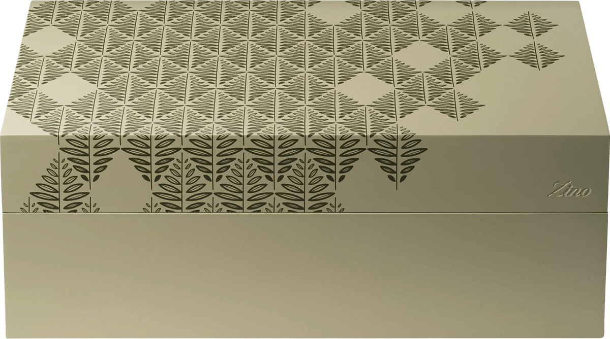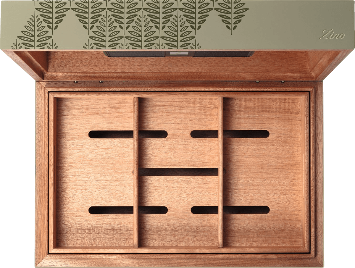 Der Innenraum ist durch einen herausnehmbaren Korb organisiert, der eine übersichtliche und flexible Lagerung ermöglicht. Zwei herausnehmbare Trennwände sorgen zusätzlich für eine individuelle Sortierung Ihrer Zigarren. Belüftungsschlitze gewährleisten einen gleichmäßigen Luftstrom, sodass jede Zigarre optimal gelagert wird. Die Außenseite des Humidors besticht durch ihr hochwertiges olivgrün gefärbtes Okoumé-Holz, das eine natürliche und elegante Optik schafft. Der Deckel ist mit einem stilvollen Tabakblatt-Muster in dunklem Grün gestaltet, während das eingestanzte Zino Logo auf der Vorderseite einen dezenten, edlen Akzent setzt.