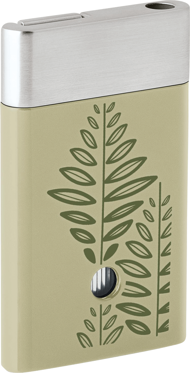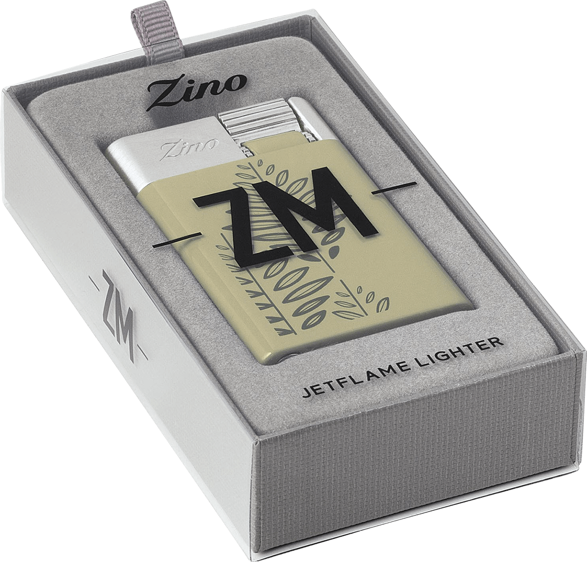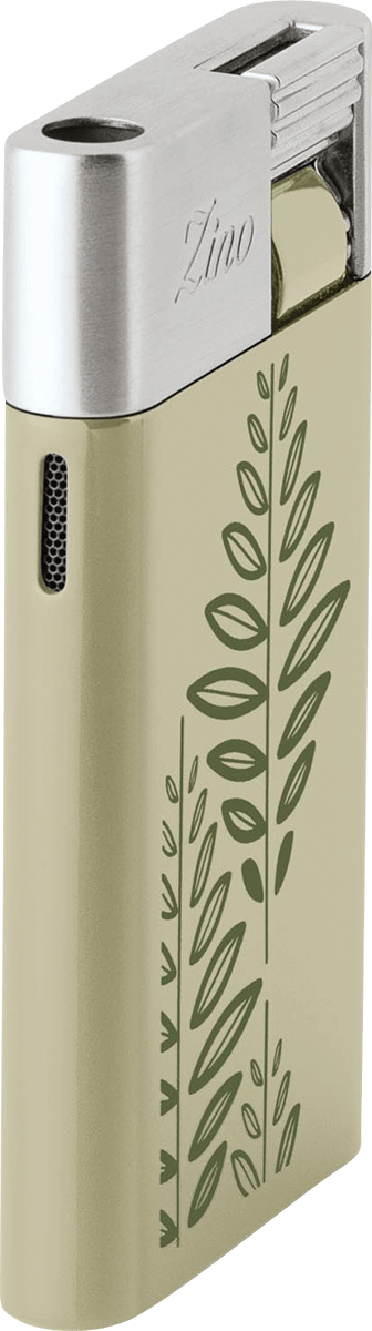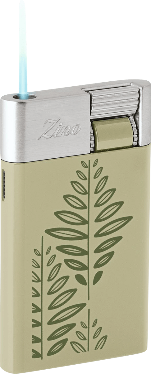 Das Oberteil besteht aus Edelstahl mit seidenmatter Oberfläche, der untere Teil aus glänzend lackiertem Edelstahl. Das dunkelgrüne Tabakblattmuster auf olivgrünem Grund verleiht dem Feuerzeug einen stilvollen Look. Praktisch ist das Tankfenster auf der Rückseite, mit dem der Gasstand jederzeit überprüft werden kann. Die Kapazität beträgt 1 g Gas und zündet bis zu 20 Zigarren an. Abgerundet wird das Design durch das gravierte Zino Logo auf dem Oberteil. Geliefert wird es in einer ansprechenden, durchsichtigen Verpackung.