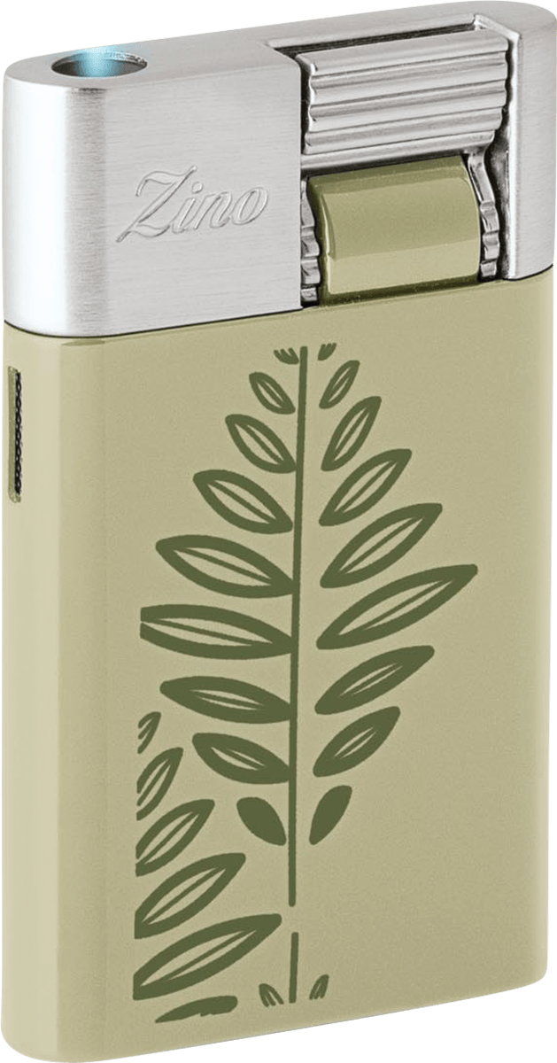 Das Oberteil besteht aus Edelstahl mit seidenmatter Oberfläche, der untere Teil aus glänzend lackiertem Edelstahl. Das dunkelgrüne Tabakblattmuster auf olivgrünem Grund verleiht dem Feuerzeug einen stilvollen Look. Praktisch ist die Füllstandsanzeige auf der Rückseite, mit dem der Gasstand jederzeit überprüft werden kann. Die Kapazität beträgt 0,6 g Gas und zündet bis zu 12 Zigarren an. Abgerundet wird das Design durch das gravierte Zino Logo auf dem Oberteil. Geliefert wird es in einer ansprechenden, durchsichtigen Verpackung.